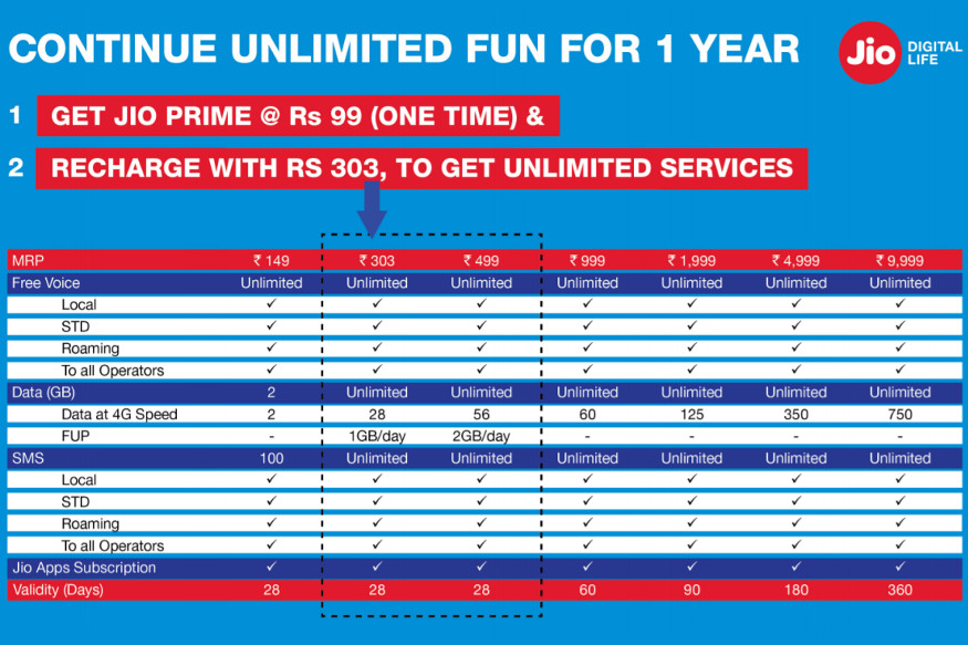 The Rs 303 Jio Prime plan offers unlimited free voice calls, free unlimited SMS, access to Jio apps along with 28 days validity. While data is also unlimited, users will receive 4G speeds for 28GB data only, after which the speed will slow down. Also, there is a daily FUP of 1GB. This means you will get 4G speeds for 1GB data consumption daily only for 28 days with the Rs 303 Jio Prime plan.