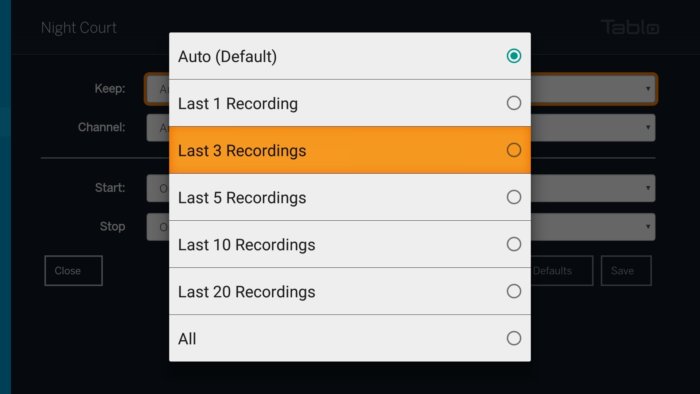 You can also proactively cut down on storage use with Tablo’s advanced recording options. When viewing a program, select “Options,” then select “Keep.” From here, you can choose to keep only a certain number of recent episodes. This is helpful for limiting your recordings of news, sports, and talk shows that you’re unlikely to binge watch in the future.